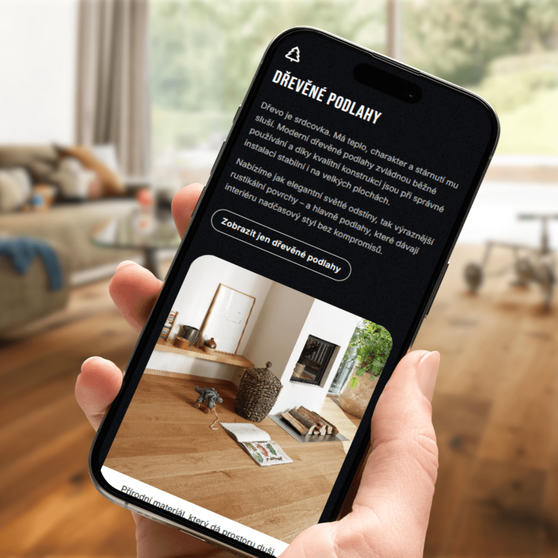 ukazoval šíři řešení (podlahy, dveře, interiéry) bez zahlcení